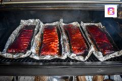 Smoke for 2.5 hours or until you get to a beautiful mahogany color. The visual queue is most important. Get ready to wrap when you have achieved the beautiful color you desire.